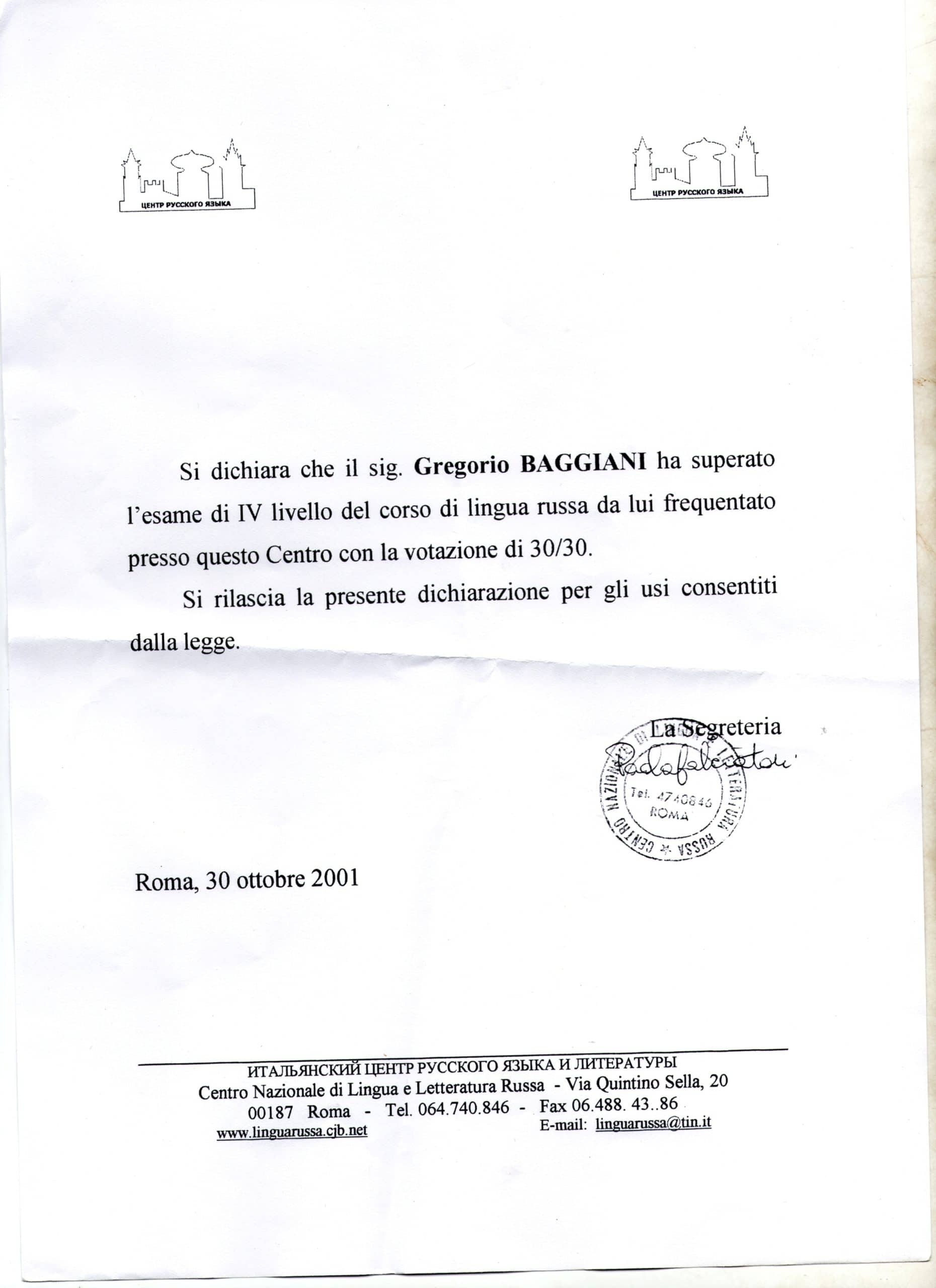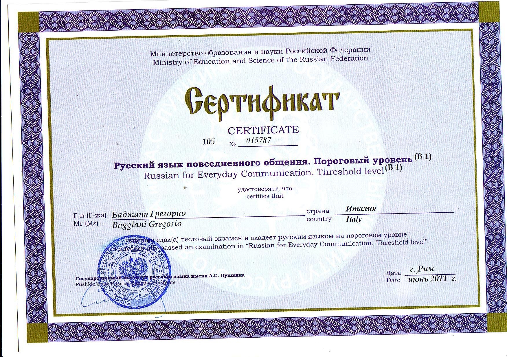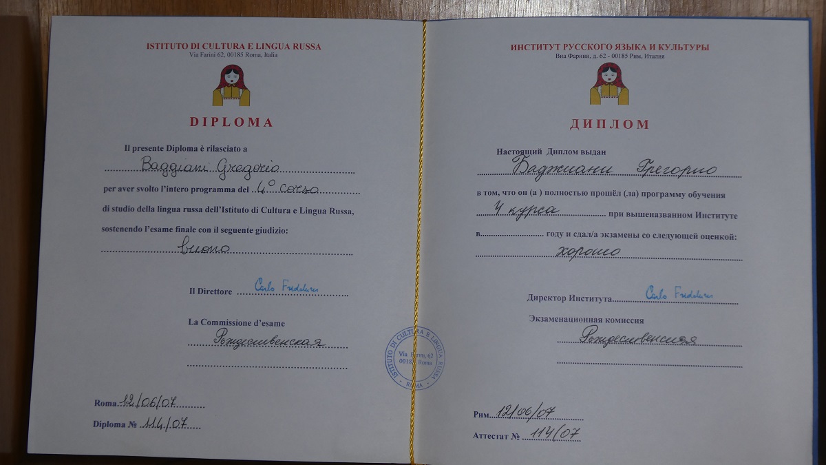 Diploma Russo Istituto Pushcin